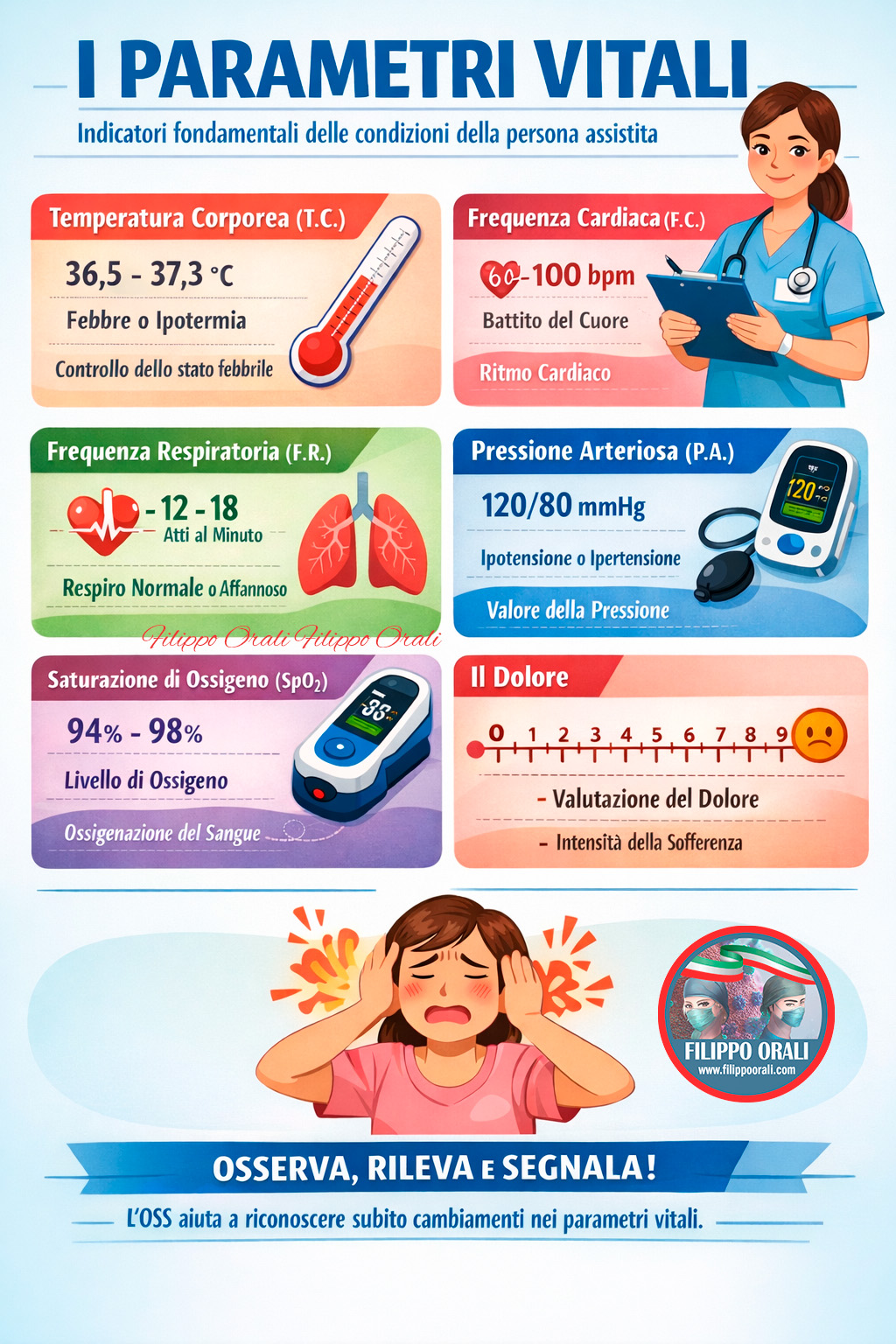 Per l’OSS è importante rilevare questi parametri con attenzione, usare correttamente strumenti semplici, osservare il paziente e riferire subito valori alterati o segni anomali. L’OSS non formula diagnosi, ma il suo ruolo è essenziale perché una rilevazione precisa e una buona osservazione possono fare davvero la differenza nella sicurezza del paziente.